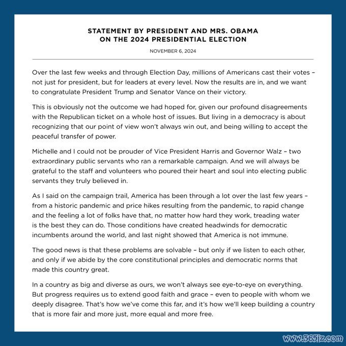 当地时间11月6日,美国前总统奥巴马与夫人米歇尔发文祝贺共和党候选人特朗普和他的竞选搭档万斯胜选。